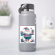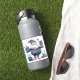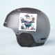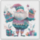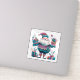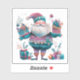 Um adesivo festivo alegre apresenta uma figura alegre adornada em padrões violetas e lacrimogêneos, segurando presentes lindamente envoltos.