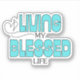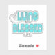 Este adesivo inspiracional apresenta a citação "vivendo minha vida abençoada" em aqua azul com coração e cruz.