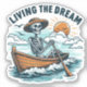 Um adesivo brincalhão com um esqueleto num barco com um pano de fundo ensolarado brilhante e a frase "Vivendo o Sonho". Perfeito para barqueiros, amantes de praia, aposentados, e qualquer um com senso de humor sobre as aventuras da vida. presente de excelente para marinheiros, pescadores e aqueles que desfrutam de vibrações irônicas engraçadas nas costas.