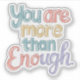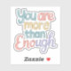 Este autocolante é um belo lembrete do seu valor e valor inerentes. Apresentando a poderosa frase "Você é mais do que suficiente" em uma fonte divertida, este adesivo é uma maneira perfeita de aumentar a autoestima e espalhar positividade. Feito com vinil durável, este adesivo é excelente para laptop, garrafas d'água, revistas, espelhos e muito mais. Compartilhe esta mensagem de amor próprio com você e outros!