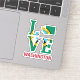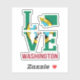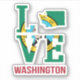 Washington amor - Washington em letras maiúsculas vermelhas com a palavra amada preenchida com a bandeira estadual. A letra O apaixonada é a silhueta com o contorno do Estado de Washington.