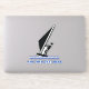 Windsurfer no conselho preto e azul do véu. Este design legal mostra um ícone de pictograma minimalista de uma silhueta preta de um surfista e seu texto sobre fundo branco com borda azul.