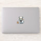 Angry looking cat with tattoo markings, bone necklace, and a skull on top of its head is sitting beside a voodoo doll with pins.