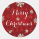 Adesivos alegres do Natal vermelhos adoráveis com flocos de neve e árvores de Natal ao fundo.