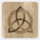 Um conjunto de autocolantes quadrados com um triquetra celta simples e colorido entrelaçado com um círculo formando um símbolo trinitário contra um fundo de madeira, representando a unidade espiritual com o divino.