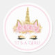 Adesivos de baby shower de unicórnio com cara de unicórnio adorável com chifre dourado, orelhas e olhos em um fundo rosa e dourado. Esses adesivos de baby shower de unicórnio rosa e dourado podem ser personalizados com o texto de sua escolha. Você também pode alterar a cor do fundo. Este é um design impresso sem brilho real.