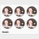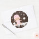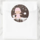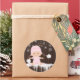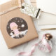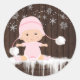 Adesivos de chá de bebê floco de neve rosa com adorável bebê menina vestindo um lindo traje de neve rosa e chapéu em um fundo rústico de floco de neve. Você pode adicionar texto para personalizar esses adoráveis adesivos de chá de bebê de inverno.