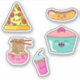5 adesivos cortados com pizza estilo Kawaii, cachorro quente, bolo de xícara, macarrão ramen e uma bebida. Cada imagem se destaca separadamente. Ótimo para diários de rabiscos, scrapbooking e marketing de restaurantes.
