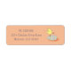 Adesivos de endereço de devolução em laranja suave com um desenho animado fofo apresentando um pintinho em pé sobre um ovo de Páscoa decorado .