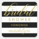 Adesivos de lembrancinha de festa de noiva apresentam listras horizontais limpas em preto e branco com texto em cor dourada moderna que pode ser personalizado para o seu evento. A cor de fundo preta pode ser personalizada.