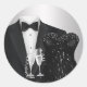 Smoking e vestido preto com adesivo de taças de champanhe. Este lindo adesivo de smoking preto e prata é facilmente personalizado para o seu evento, bastando escolher o botão "Personalize!" para começar a adicionar seu texto, estilo de fonte, tamanho e cor da fonte e texto. Você também pode deixá-lo exatamente como está e ele funciona bem como selo de envelope e etiqueta de lembrancinha de festa. Por favor, note que todos os desenhos de cartões e convites que você encontrará no Zazzle são gráficos impressos sem joias, laços, relevos, dourados ou peças ou partes adicionadas.