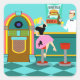 Sirva algo especial com esses adesivos Retro Soda Fountain. A arte minimalista, a design de desenho animado mostra o interior do lugar mais legal da cidade. É uma fonte de refrigerante de 1950, em toda sua glória de gatinho! Contra o pano de fundo de um aqua wall, podemos ver uma poster a anunciar a especialidade da casa. A poster mostra um hambúrguer e uma garrafa de pop pelo preço de barganha de 15 centavos. Com preços como estes, deve ser difícil ver sua cintura! Um idiota de soda mais competente está mandando o contador de chá com sotaques amarelos. O jovem com uma forte ética de trabalho está segurando um cone de sorvete com um solteiro de sorvete amarelo-limão — embora, para ser justo, possa ser abacaxi! O rapaz limpo está vestindo uma camisa branca, primitiva, com uma gravata arco preta e um chapéu branco com sotaques vermelhos. No lado oposto do balcão, vemos três fezes de bar vermelho e cromo. Empolgada numa das fezes está um adolescente loiro cuja boca está certamente a regar. Não está claro se a boca dela está regando sobre o cone de sorvete que está dirigindo seu caminho ou o jovem industrioso que está servindo. Ela está vestindo uma saia de poodle rosa e uma forma que se encaixa em preto. As fechaduras amarelas dela são puxadas de volta num rabo de cavalo clássico. Ao lado dessa beleza de um cliente, há uma jukebox colorida e clássica, que apresenta luzes castanhas, grãos de madeira, desfiladeiros e néon coloridas. Melhor do que isso, é certo que todos os maiores acertos de rock and roll do tempo! O chão deste salão de sorvete moderno de meio século é um padrão aqua e lacrimejante que está gritando para alguém experimentar todos os últimos movimentos de dança.
