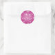 Adesivos encantadores de Feliz Natal rosa com flocos de neve e árvores de Natal ao fundo.