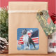 Um orgulhoso touro azul e branco Pit (American Staffordshire Terrier) em frente a uma bandeira americana ondulando e ao céu azul.