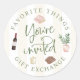 Adicione um toque sofisticado e pessoal aos seus convites com esses selos de envelope de troca de presentes "Coisas Favoritas". Os adesivos redondos apresentam a frase "Você está convidado" em uma fonte manuscrita da moda, rodeada por ilustrações charmosas em aquarela de presentes e itens favoritos. Esses selos são o toque final perfeito para os convites da sua festa, garantindo que eles se destaquem e deixem seus convidados animados para o evento. © Kimbellished, LLC