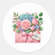 O adesivo é mostrado em uma bela impressão artística de buquê floral.