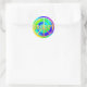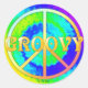 Estes adesivos de ranhura têm um fundo psicodélico de gravata-cotovelo com um sinal de paz pastel e a palavra "Groovy" em letras douradas.