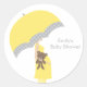 Cartazes doces e chicos com uma mãe grávida segurando um guarda-chuva amarelo e um ursinho de pelúcia. Perfeito para chás de fraldas neutros em termos de gênero.