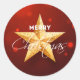 O adesivo Natal Holiday é mostrado numa impressão festiva de estrelas de ouro com saudação. É apresentado um autocolante de tamanho pequeno.