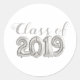 Esses simples adesivos redondos apresentam um gráfico de balão de hélio prateado "Turma de 2019" contra um fundo branco. São perfeitos para selar envelopes ao enviar anúncios de formatura ou convites para festa de formatura.