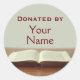 Estes adesivos personalizáveis têm uma imagem de um livro aberto numa mesa. Eles dizem, "Doado pelo seu nome." Adicione seu nome ou outro texto na modelo para personalizar. Você pode alterar qualquer uma das palavras, estilo de fonte ou cor, ou escolher um tamanho ou forma diferente de adesivo. Isso é perfeito para escritores e autores. Coloque estes vinil adesivos em seus livros mais recentes, depois doe-os para a biblioteca, deixe-os depois de uma assinatura de livro, ou use-os para presentes de marketing ou promocional. Mais adesivos e botões de autor e escritor, além de livrarias personalizadas no Lápis de Alina.