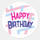 Um adesivo de aniversário colorido com as palavras "Parabéns em letras negrito.