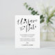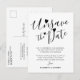 Cartão postal de anúncio de adiamento de casamento com tipografia de fonte de script moderno de corações de data não salva