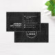 Design de cartão de visita moderno e masculino com campos modelo para nome, nome/cargo da empresa, logotipo (foto ou outro gráfico) e informações de contato, incluindo ícones das mídias sociais em uma cinza muito escura, quase preta, fundo de textura industrial áspera. Alterar fontes, mover e redimensionar elementos com a ferramenta de personalização. Siga-nos no Facebook: @business stationery para mais produtos, notícias, vendas e muito mais.