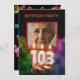 Adicione uma imagem para personalizar este convite de festas único.Um convite de aniversário 103º divertido com números de velas felizes queimando em um cupcake de chocolate. Certifique-se de mudar o nome no verso para o nome do aniversariante ou garota. Veja toda a gama de convites e cartões na minha loja.