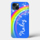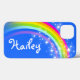 Ajude a proteger o iphone 6 da sua criança contra batidas e acidentes de criança, com este bonito caso do design arco-íris iphone 6. Personalize com seu nome infantil até 5 letras, nomes perfeitos ou apelidos. Este exemplo diz Hailey. Desenvolvido exclusivamente e ilustrado por Sarah Trett.