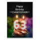 Queimando velas de bolo de 63 anos em forma de números em cima de um cupcake de chocolate. Personalizar com o nome da pessoa de aniversário. Adequado para um homem ou uma mulher. Veja toda a gama de cartas para idades e relacionamentos na minha loja. Todos os direitos de autor da trabalho de arte Norma Cornes