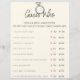 Adivinha quem é um jogo de adivinhação interativo e divertido. Perfeito para qualquer Chá de panela temático, festa de solteira, festa de galinha, festa de noivado e Chá de casamento. Os convidados terão a oportunidade de mostrar quem mais conhece a noiva. Inclui instruções simples na folha de jogos. Assim que todos os convidados tiverem a oportunidade (cronometrada) de adivinhar cada resposta correta, o convidado com a pontuação total mais alta ganhará. Perfeito para planejadores de Casamento, planejadores de eventos, DIY Brides, Madrinha de casamento, Matriz de Honra, amigo da noiva, ou qualquer pessoa responsável por hospedar o evento.