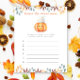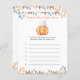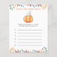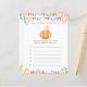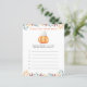 "Uma pequena abóbora está a caminho. Celebre com este tema de abóbora de desenho animado para o baby shower! Abóbora kawaii de desenho animado fofa com chapéu de outono e folhas de outono. No verso do cartão estão folhas de outono.