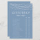 Esta adorável e empoeirada luz azul LGBTQ Adivinha Quem? A folha de chá de panela é simples e encantadora - perfeita para qualquer chá que comemore duas noivas. Este jogo fácil e divertido traz muitas risadas a qualquer chá de casamento! Basta dar uma folha a cada convidado (não se esqueça das canetas) e deixar a diversão começar! Ficará surpreso com quantas coisas as pessoas sabem sobre as noivas. Em segundos você pode ver como sua folha de jogo ficará. Basta selecionar Personalizar este Modelo e digitar os nomes das noivas.