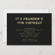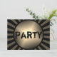 Convite de aniversário para o adolescente. Cores de ouro preto e sujo com estilo de fonte verde em uma placa horizontal. Grande inscrição "Partido" na frente, com texto impresso angustiado no verso. Personalizar facilmente com tantas linhas de texto quantas forem necessárias no formulário de parágrafo.