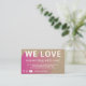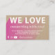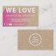 Personalize este cartão de marketing comercial moderno. Isso é perfeito para um negócio de comércio eletrônico, como uma butique, loja Etsy ou qualquer outra pequena empresa. Ele apresenta a frase "NÓS AMOS" e tem texto personalizável para explicar mais detalhes. O verso pode ser usado para exibir o logotipo personalizado da sua empresa. Este produto expressa interesse em se conectar com os clientes, encorajando os compradores a enviar mensagens para você e a seguir seus negócios nas mídias sociais com as informações fornecidas ao lado dos ícones do Facebook, Instagram e YouTube nas mídias sociais.