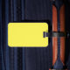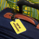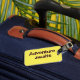 Etiqueta de bagagem amarela com palavras de marrom.
