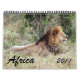 calendário 2011 que caracteriza 15 animais africanos de surpresa em seus ajustes selvagens naturais. Inclui o leão, a zebra, a chita, o girafa, o elefante, o flamingo e o mais.