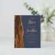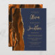 A borda esquerda deste elegante convite de casamento moderno apresenta uma cor de água laranja queimada, aparada com falsa brilho dourado. O texto personalizável combina um script dourado, fontes copperplate e itálico em um fundo azul marinho escuro. O verso apresenta uma design de cor laranja queimada e dourada.