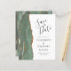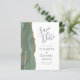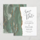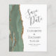 A borda esquerda deste elegante casamento moderno salve o cartão de data apresenta uma faixa verde-aquarela agata bordada com falso brilho dourado. O texto personalizável combina a escrita manual de cinzas de carvão, as fontes em copperplate e itálico em um fundo branco. O verso apresenta um design verde-sábio e um agate dourado correspondentes.