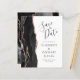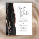 A borda esquerda deste elegante casamento moderno salve o cartão de data apresenta uma borda de agata preta, aparada com uma falsa rosa dourada. O texto personalizável combina a escrita manual de cinzas de carvão, as fontes em copperplate e itálico em um fundo branco. O verso apresenta um design de agate preto e rosa dourado correspondente.