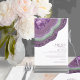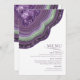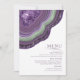 Nem todos os designs de casamento são criados iguais. Os layouts assimétricos para as peças neste impressionante conjunto de casamento provam que isso não é ruim! Bandas de cor onduladas em tons contrastantes de roxo violeta e verde com um centro de cristal brilhando formam um sotaque geode/agate na maioria das peças do conjunto. O cartão 'Menu' do casamento mostrado aqui apresenta o acima mais uma modelo para adicionar suas seleções de menu de casamento pertinentes. O contrário também permite que você adicione os nomes da noiva e do noivo e a data do casamento. Procure ID647 para ver todas as peças de coordenação neste conjunto.