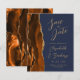 A borda esquerda deste elegante casamento moderno salve o cartão de data apresenta uma borda agitada de cor laranja queimada, aparada com falsa brilho dourado. O texto personalizável combina manuscrito dourado, fontes em copperplate e itálico em um fundo azul marinho. O verso apresenta uma design de cor laranja queimada e dourada.