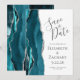 A borda esquerda deste elegante casamento moderno salve o cartão de data apresenta uma coloração azul lacrimogênea cortada com brilho de prata. O texto personalizável combina a escrita manual de cinzas de carvão, as fontes em copperplate e itálico em um fundo branco.