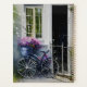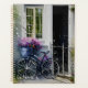 Uma bicicleta fica perto da porta de uma casa em um jardim de verão. A bicicleta é um modelo simples, com uma cesta na frente. A cesta é cheia de flores, que estão em flor de cheio. Eles criam uma bela e colorida exibição.