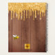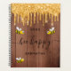 Decorado com abelhas-desmancha-prazeres, amarelas e negras felizes e sorridentes. Um muro marrom rústico de madeira, estilo country como fundo. Decorado com pingos sujos de ouro, pintura pingando aparência. Script com letras pretas, com hastes e o texto: Bee Happy.  Personalize e adicione seu nome e um ano. Perfeito para a escola, o trabalho ou a organização da sua vida pessoal/familiar.