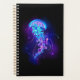 Água-viva grande, azul, desenhada artisticamente, brilhante, brilhante, com longos tentáculos sobre fundo preto com bioluminescência roxa. Água-viva luminosa.