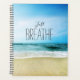 Linda praia arenosa, ondas azuis e céu enevoado com as palavras "apenas respire". Paraíso!