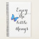 "Aproveite as coisinhas" citações motivacionais da tipografia do carvão na letra da cinza. Borboleta azul com asas iridescentes sobre fundo branco