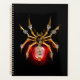 Aranha mecânica, com pá-pá de ouro, engrenagens de latão e uma lâmpada de vidro vermelha sobre fundo preto. Estilo Steampunk.